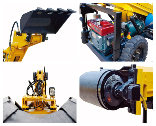 該機器動力源為外部引入380V三相交流電源電動機與本機自帶柴油機結(jié)合。采用一臺主電機和一臺電動滾筒為主工作動力,柴油機動力方便機器移位等。功能包括行走、挖掘采集、輸送、裝車、清底等功能。其中行走由液壓馬達驅(qū)動,具有前行、后退和自動剎車功能,挖掘采集由機械手執(zhí)行,通過液壓操作控制機械手上下左右回轉(zhuǎn)完成挖掘、采集、裝料、卸料。由電動滾筒帶動皮帶進行輸送,裝車時輸送機由兩根液壓油缸頂升并鎖定油缸作為支點進行裝卸作業(yè) 。